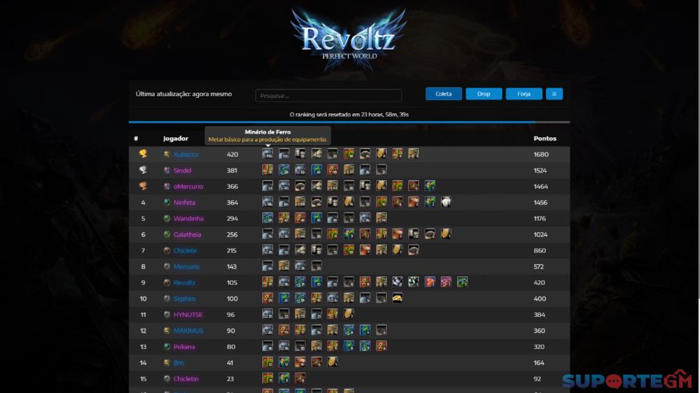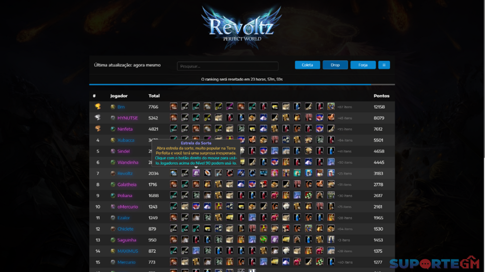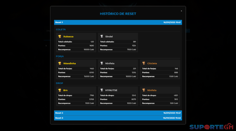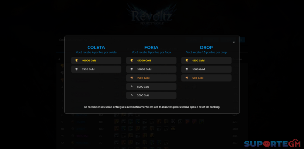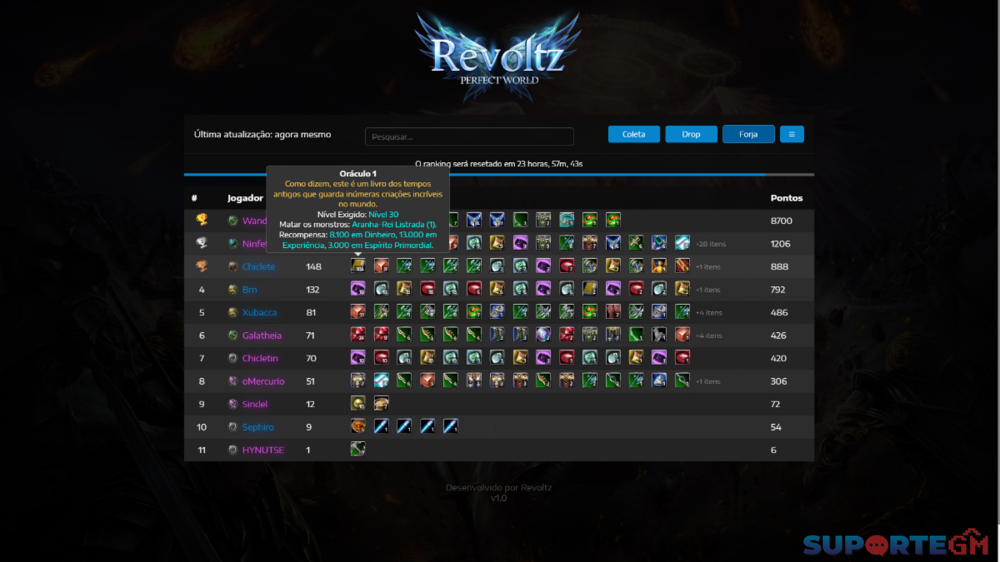 Apresento o meu projeto de Ranking PVE, agora disponível para venda em meu site! Demo: [Conteúdo Oculto] Ranking Forja; Ranking Coleta; Ranking Drop; Quando clica em um personagem: Modal de informações de recompensas Histórico de Resets + detalhes no link: [Conteúdo Oculto] Agradecimentos especiais ao @Shepiro por confiar no meu trabalho e ainda, fornece o server para testes.1 ponto