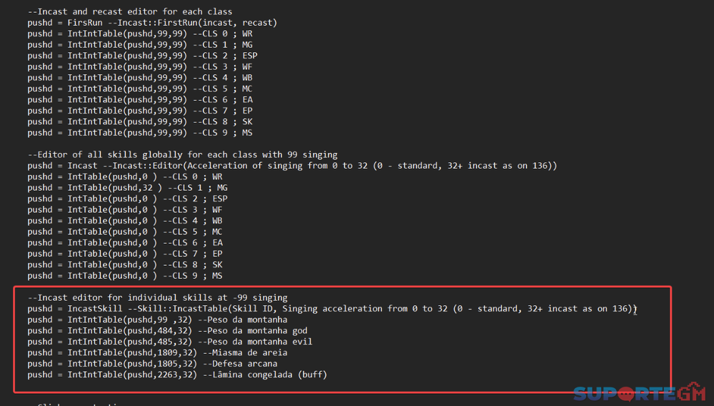 7. Estou usando a 1.5.5 com lua e tentando descobrir o porquê de algumas skills não bugarem cast, está mostrando a barra de conjuração, mesmo com minha cast 99%, como defini o recast no script não faz diferença se minha cast passar de 99%, as skills 79, 100, morai não bugam mesmo eu definindo elas para fazer isso no script, já troquei a gs, script e tudo que foi preciso na pasta element para os arquivos da build original. Anexado print da parte do script responsável por isso, até onde eu sei kkkk