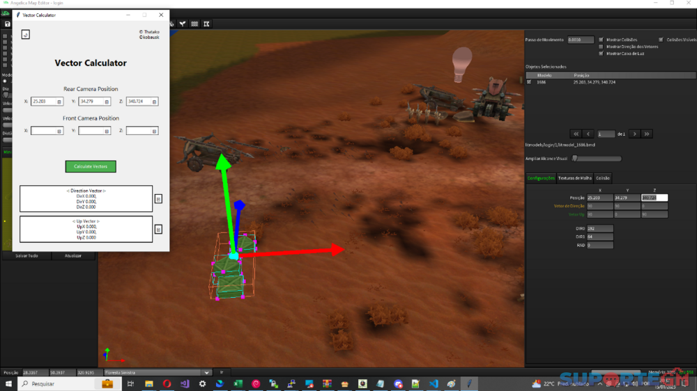 Abrir o editor AngelicaMapEditor. Obter as coordenadas iniciais (X.Y.Z) no modelo 3D. Mover o modelo 3D para uma nova posição e, em seguida, obter as novas coordenadas (X.Y.Z). Clicar em "Calcular" para gerar os seguintes resultados: Direção do Vetor: DirX = 1.0000 DirY = 0.0000 DirZ = 0.0000 Vetor Up: UpX = 0.0000 UpY = 1.0000 UpZ = 0.0000 Fix de seleção.rar
